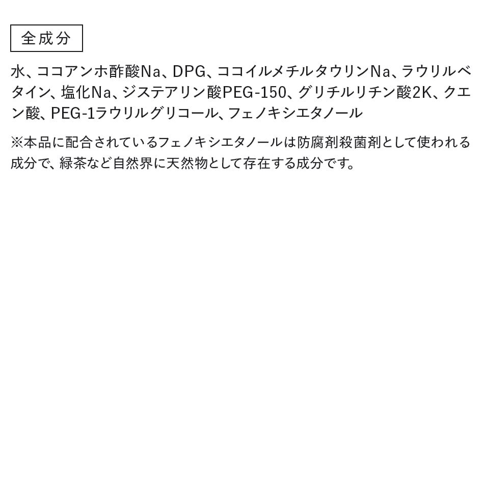 水、ココアンホ酢酸Na、DPG、ココイルメチルタウリンNa、ラウリルベタイン、塩化Na、ジステアリン酸PEG-150、 グリチルリチン酸2K、クエン酸、PEG-1ラウリルグリコール、フェノキシエタノール ※本品に配合されているフェノキシエタノールは防腐剤殺菌剤として使われる成分で、緑茶など自然界に天然物として存在する成分です。 |