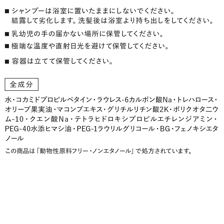 水・コカミドプロピルベタイン・ラウレス-6カルボン酸Na・トレハロース・オリーブ果実油・マコンブエキス・グリチルリチン酸2K・ ポリクオタ二ウム-10・クエン酸Na・テトラヒドロキシプロピルエチレンジアミン・PEG-40水添ヒマシ油・PEG-1ラウリルグリコール・BG・ フェノキシエタノール※本品に配合されているフェノキシエタノールは防腐剤殺菌剤として使われる成分で、緑茶など自然界に天然物として存在する成分です。 |